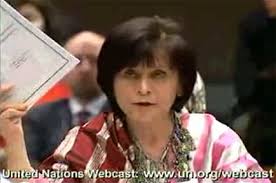 Gina Waldman, wearing her grandmother's bridal dress, gives testimony to the UN Human Rights Commission in 2008